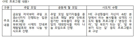 지난 15년간 교세통계에 나타난 대표적인 평신도 사도직 운동의 최근 동향은 ‘레지오마리애’, ‘성령운동’, ‘포콜라레’, ‘꾸르실료’는 현상유지인 반면 ‘ME운동’은 정체 혹은 감소로 드러난다. 현장에서 체감되는 상황이 궁금했는데 정이사장은 참가 부부 수가 최근 줄어든 건 사실이지만 눈에 뜨일 정도는 아니라고 한다. 이는 최근 들어 ME와 유사한 지향을 갖는 가정회복운동의 유행 흐름과도 관련이 깊어 보인다. 대표적인 것이 2005년경부터 시작된 아버지학교다. 성요셉학교라는 이름으로 진행되는 이 운동은 아버지가 바로 서야 가정이 바로 선다는 모토로 각 교구로 확산되고 있다. 아버지학교의 출발은 1991년 개신교의 두란노교회에서 시작돼 일종의 사회운동처럼 번져나간 것에서 영감을 받은 듯 보인다. 건강한 가정을 지향한다는 면에서 이 운동은 ME와 겹치는 면이 있다. 정이사장은 “서울교구의 경우에는 부부여정, 아버지여정, 어머니여정과 같은 유사 가정회복 프로그램들이 대대적으로 생겨나고 있고, ME 관계자 중에서는 중복돼 활동하는 경우도 종종 있기 때문에 ME 운동의 정체나 감소 현상은 이와 같은 맥락에서 이해해야 한다”고 말한다.